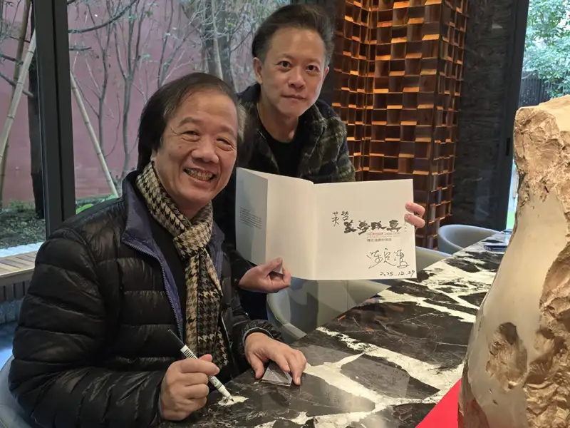 尉寶大敦主人現場銷售副總鄭弘昆與藝術家吳極交流對話。(記者夏鈺晴攝)