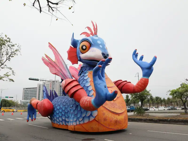 大型機械裝置燈怪花車於台灣燈會踩街活動中亮相,隨音樂節奏轉動眼睛、揮動翅膀並與民眾互動,成為全場矚目焦點。(圖/嘉義縣政府提供)