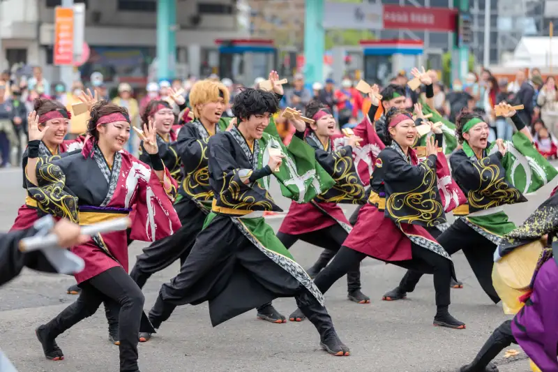 日本舞團於台灣燈會踩街活動中活力登場,舞者手持鳴子木板,隨節奏整齊舞動,展現熱情奔放的夜來祭風采。(圖/嘉義縣政府提供)