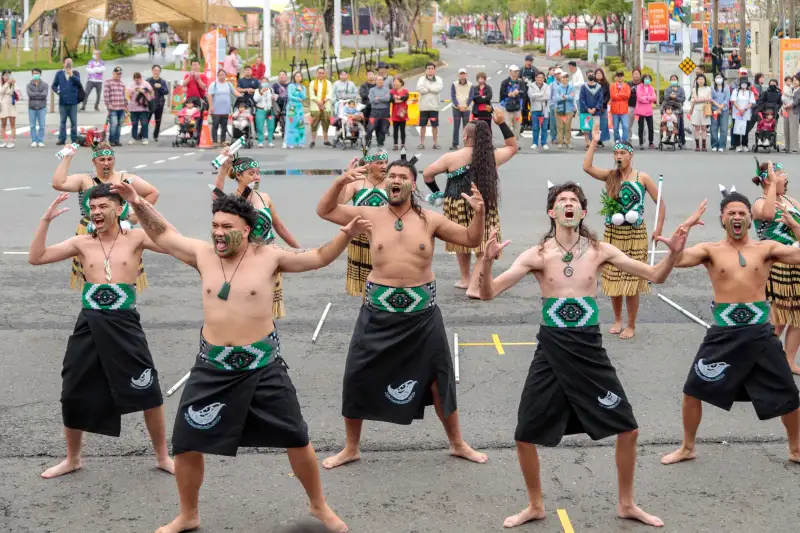 紐西蘭毛利文化表演團於燈會踩街活動中帶來震撼人心的Haka戰舞演出,以強烈肢體動作與吶喊展現傳統文化力量,吸引現場民眾熱烈圍觀。(圖/嘉義縣政府提供)