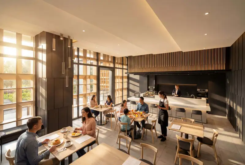 把豪宅服務下放,用「供餐社區」解決雙薪痛點!相較多數主打規格或地段的個案,「織光森鄰」更明確從生活模式切入。該案導入清水少見的「社區供餐機制」,設置輕食餐飲空間,由社區秘書協助運作,平日提供中、晚餐,假日供應三餐,並採點數制收費。這項設計背後的判斷其實很直接—雙薪家庭已成主流,而「下班後還要煮飯」正是最真實的生活壓力。新業選擇用一個相對低門檻的方式(每戶月費轉點數),試圖把過去僅存在於豪宅的服務,轉化為日常生活的一部分,並預計由建商輔導前一年營運。
