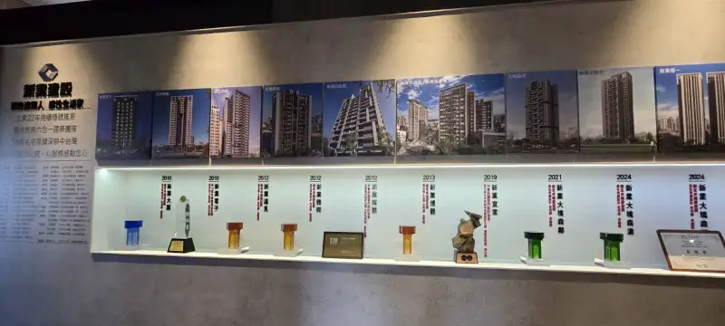 新業建設歷年建案獲獎牆,展示公司多年來在規劃設計、施工品質與社區經營上的專業成果,彰顯品牌穩健實力與市場口碑。圖/常喜悅