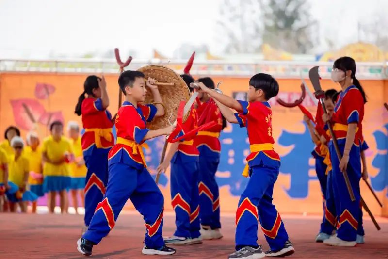 內門國小學童展演宋江陣技藝,展現傳統藝陣文化向下扎根的成果。(圖/高雄市觀光局提供)