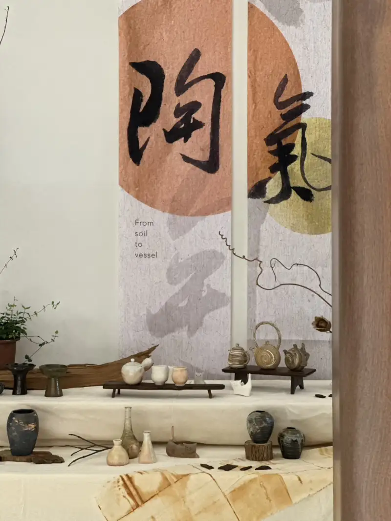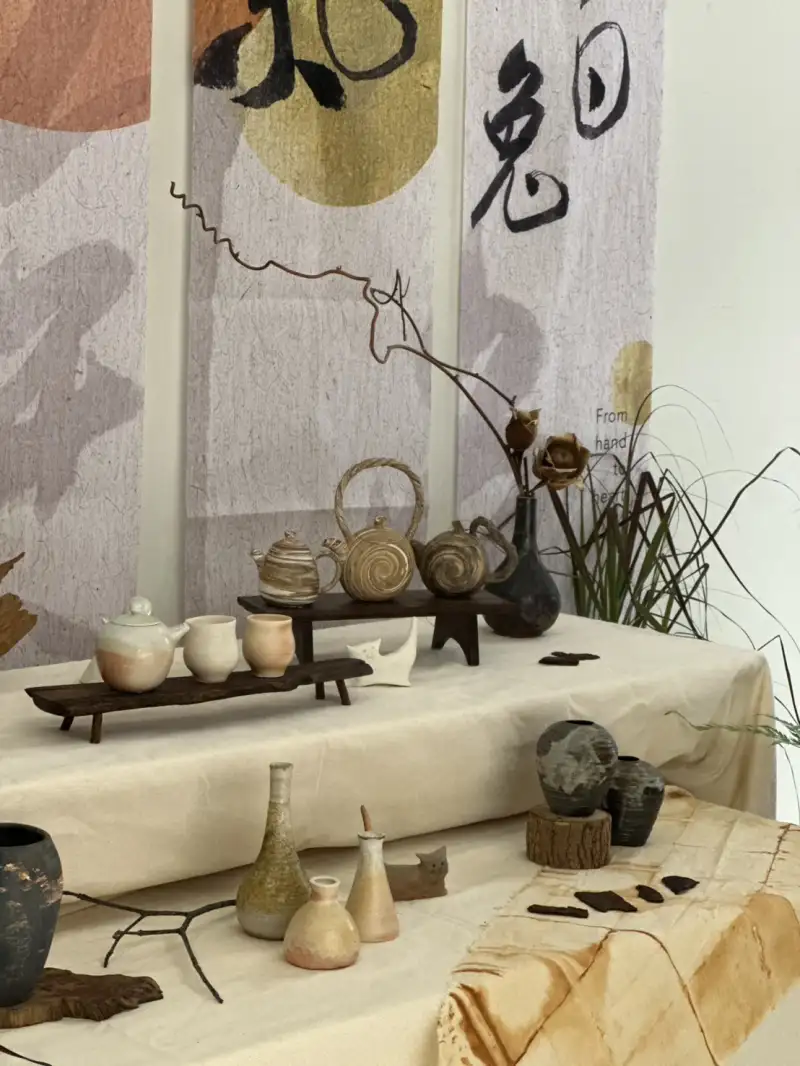 這次推出的「陶氣小白兔」雙人陶藝展,邀請陶藝家張麗玲與周蓮嬌共同展出。兩位藝術家以不同的生命步調走入陶藝世界,作品以柴燒為主軸,經1200度高溫燒製,自然落灰、生成灰釉。木灰在火焰與煙霧的交織中,呈現出變化萬千的釉色與紋理,讓每件作品都帶有獨一無二的自然之美。展出作品包括茶器、花器等,質樸溫潤的手感深受收藏者喜愛。