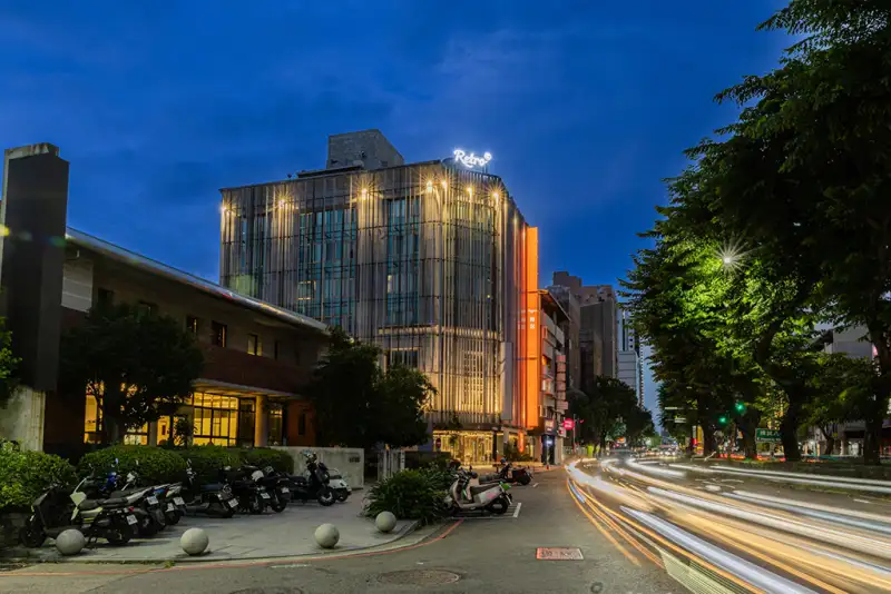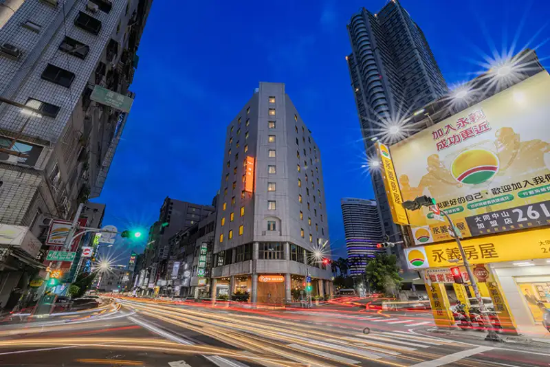 高雄市中心的「橙居高雄館」,晚間外觀燈光溫馨明亮,展現都會飯店的現代質感。圖/百橙國際提供