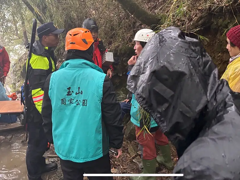 搜救隊伍不畏低溫雨勢,於玉山步道上迅速完成救援行動。(圖/ 竹崎分局 提供)