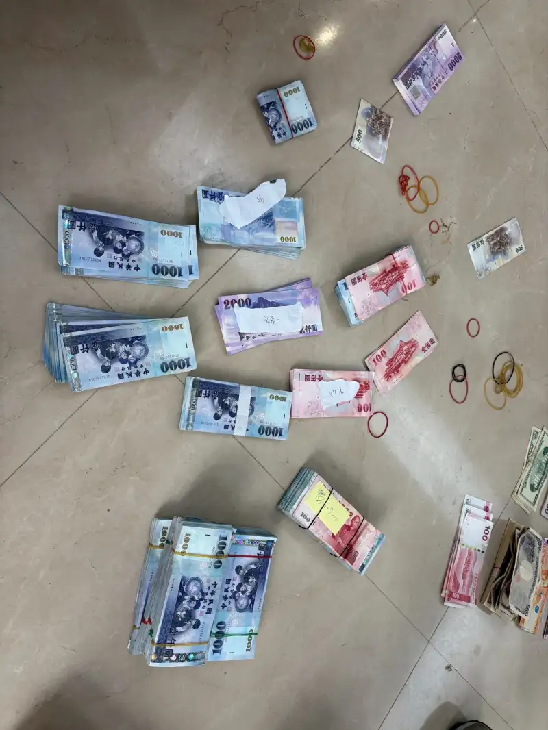 查扣之虛擬貨幣、現金、存摺及外幣等證物由警方現場清點。(圖/高雄市刑事警察大隊)