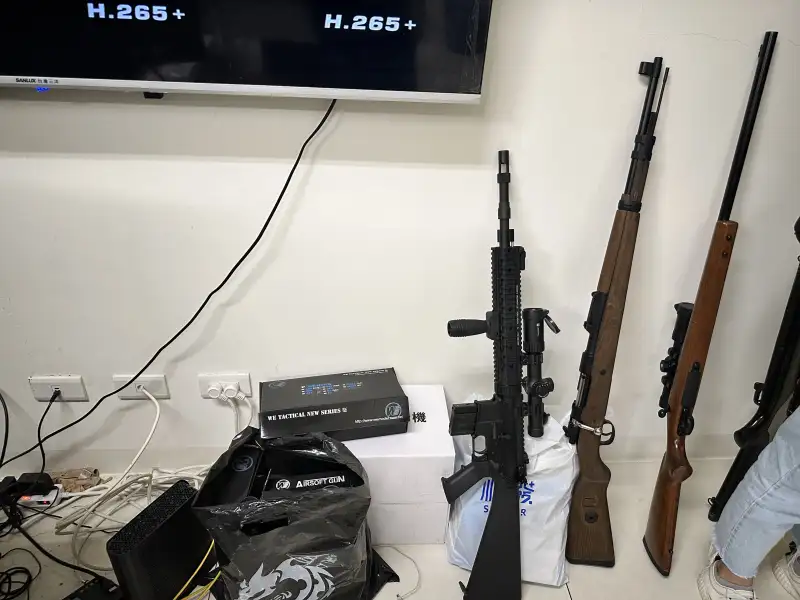 刑事警察局查緝非法博弈機房,查扣電腦主機、監控設備及疑似作為壯膽用之擬真長短槍等證物。(圖/刑事局南打提供)