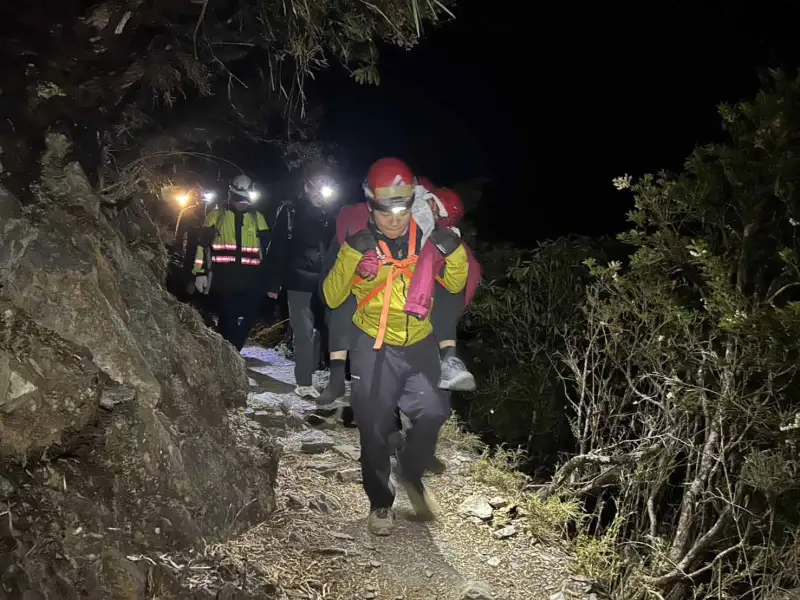 救援人員於凌晨0時37分抵達後,先確認傷者意識清楚,隨即展開架繩固定與吊掛作業,將其從邊坡拉回步道。由於山區地形陡峭且夜間視線不佳,後續改採人力接力方式進行撤離。