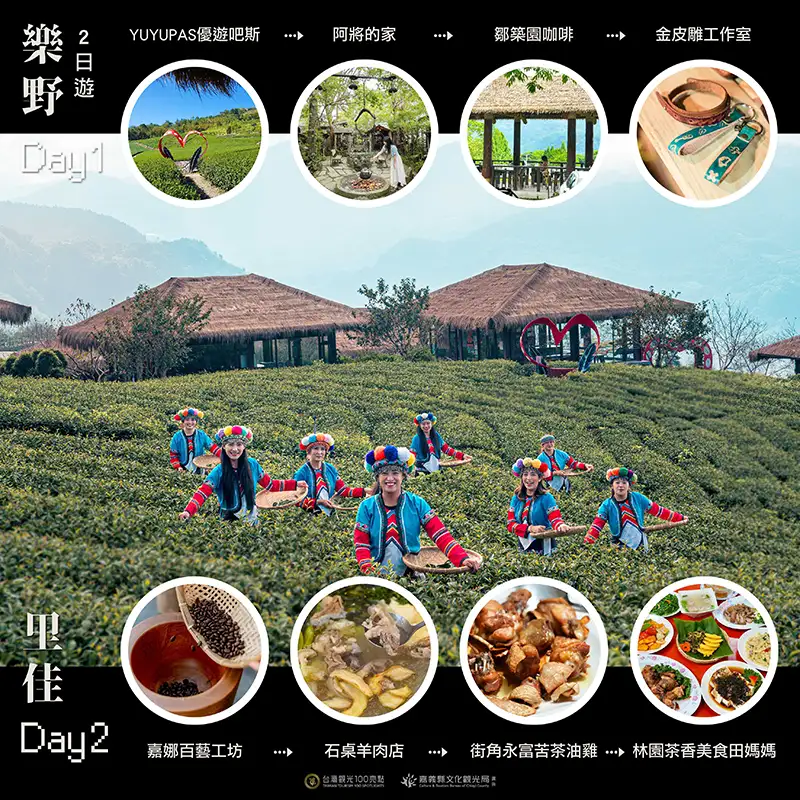 樂野部落是茶香、咖啡香與文化交織的起點,旅程首站建議造訪「YUYUPAS優遊吧斯」,園區以五座仿鄒族傳統茅草屋建構,融合鄒族歌舞展演、風味餐與高山茶、咖啡體驗,是了解鄒族文化的最佳起點。
