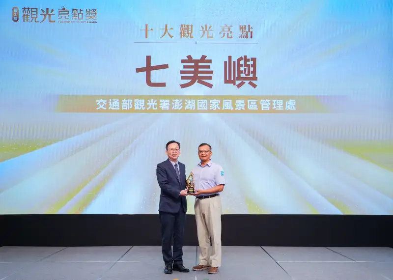 交通部次長林國顯、觀光署署長陳玉秀11月11日出席由觀光署舉辦第2屆「觀光亮點獎」頒獎典禮,澎湖景點大放異彩。包括由交通部觀光署澎湖國家風景區管理處(以下簡稱澎管處)推薦之「七美嶼」,榮獲全臺「十大亮點獎」殊榮外;另「大菓葉玄武岩」及由澎湖縣政府推薦之「員貝嶼」亦雙雙入選2026–2027年「台灣觀光100亮點」。此佳績不僅展現澎湖觀光的豐沛實力,更讓全國看見海島風光與人文底蘊交織的澎湖魅力,為永續旅遊注入新活力與契機。