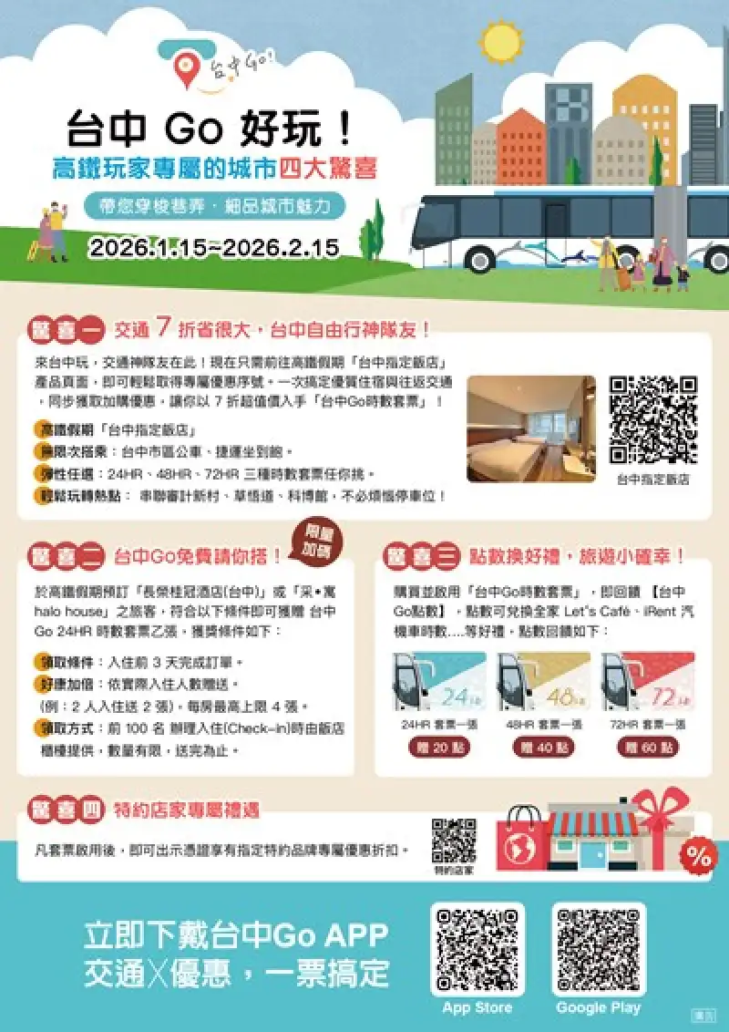 此外,活動期間旅客至特約合作商店出示「台中Go暢遊型套票」畫面,也能享有餐飲、旅宿等指定品牌專屬優惠,讓移動過程延伸為多元旅遊體驗,相關優惠資訊將同步揭露於台中Go網站最新消息提供旅客一站式查詢( https://www.taichung-go.tw/ch/index )。