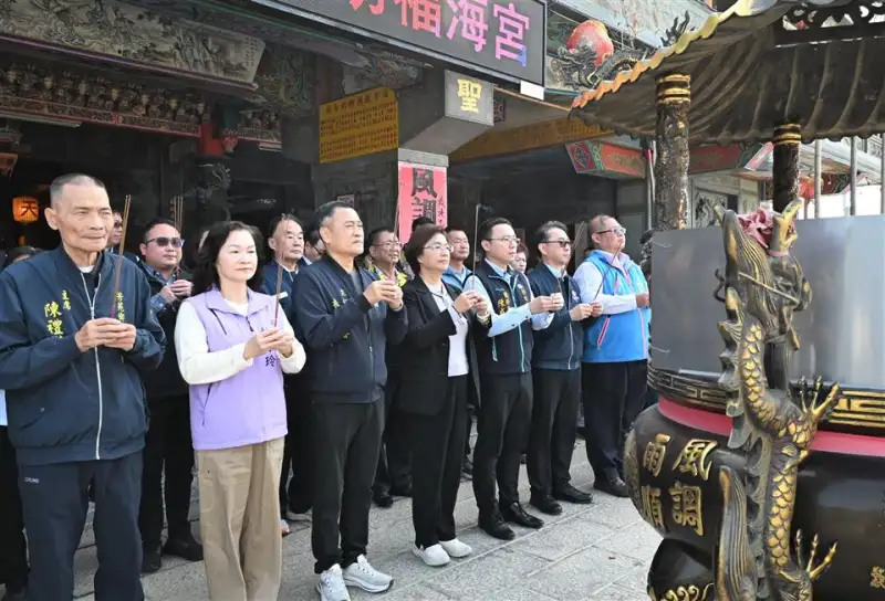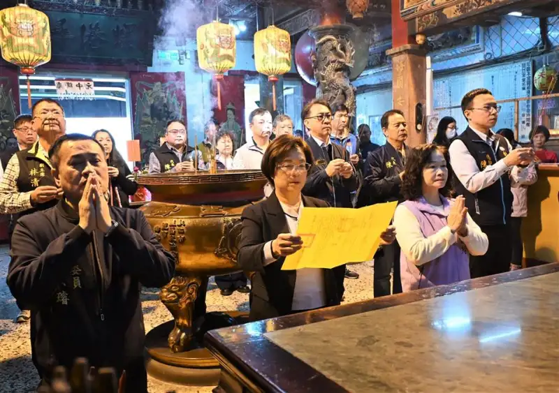 彰化縣長王惠美率同與會貴賓於王功福海宮擲筊祈福,祈求2026王功漁火節活動圓滿順利。(圖/彰化縣政府 提供)