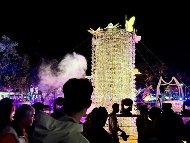 民眾步入展區,首先映入眼簾的是「繽紛HAKKA」,展現濃厚的人情味;接續「鳳祥瑞彩」燈組,以母親河守護族群的意象,串聯整體故事脈絡。主燈「蝶舞水光」則以壯麗瀑布光雕為視覺核心,搭配震撼聲光燈光秀,平日每小時、假日每半小時展演一次,在水氣與光影交織中,演繹源源不絕的生命力與文化能量。