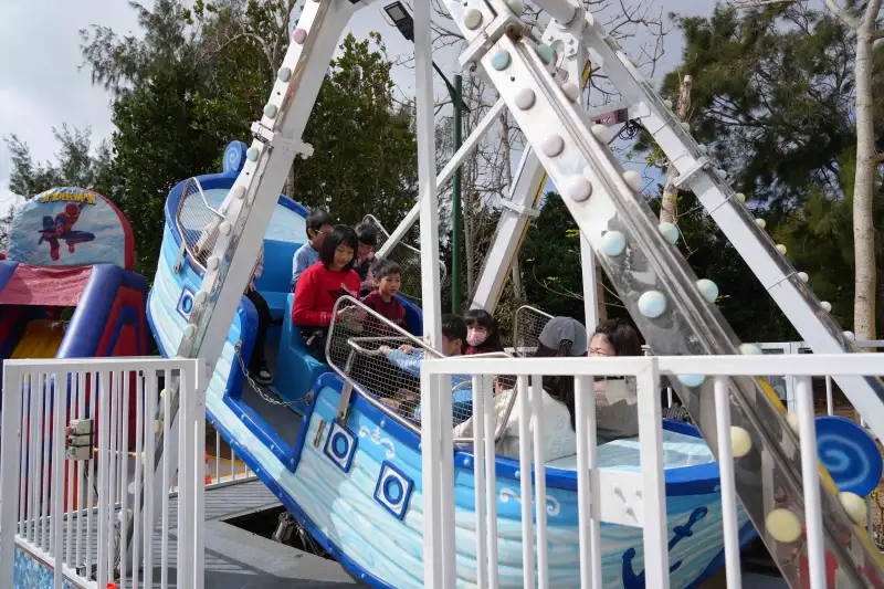 澎湖冬日花海遊樂園設置多項親子遊樂設施,小朋友開心體驗海盜船等遊具,家長陪同同樂,現場洋溢歡笑聲。(圖/澎湖縣政府提供)