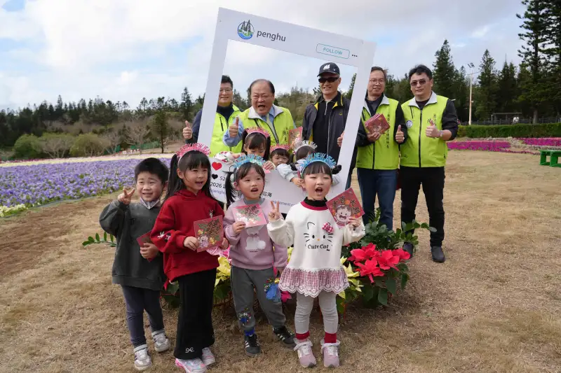 澎湖縣長陳光復與小朋友一同在繽紛花海中合影,現場充滿歡笑與溫馨年節氣氛。(圖/澎湖縣政府提供)