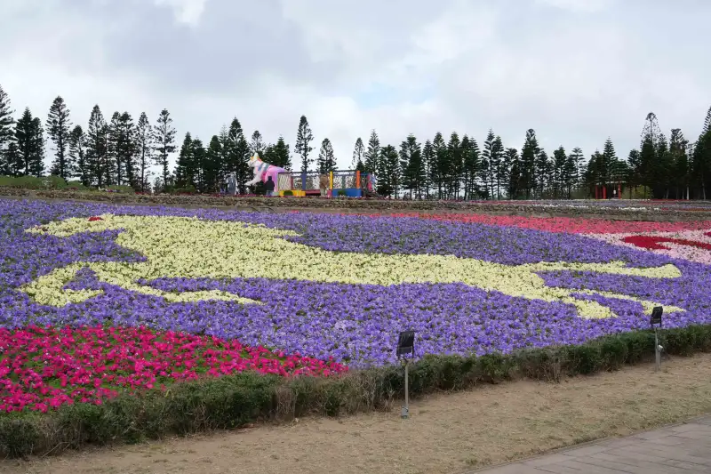澎湖冬日花海遊樂園以超過20萬株矮牽牛打造大型圖騰花海,色彩繽紛、層次分明,成為春節期間最吸睛的拍照打卡景點。(圖/澎湖縣政府提供)