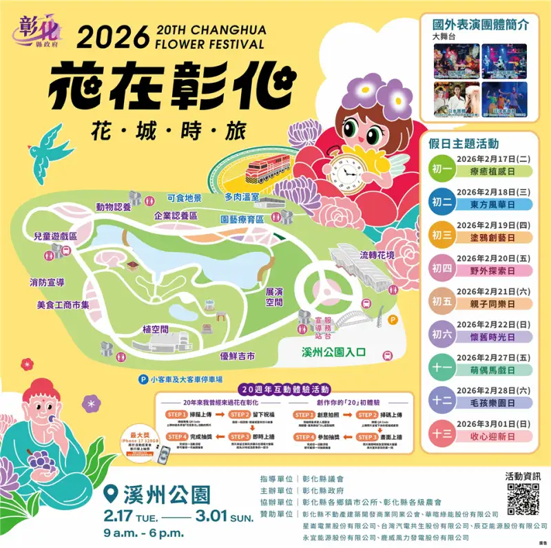 官方活動資訊: 白天賞花:溪州公園-花在彰化 活動期間:115/2/17~115/3/1 9:00~18:00 活動官網:https://www.ch-flower2026.com.tw/