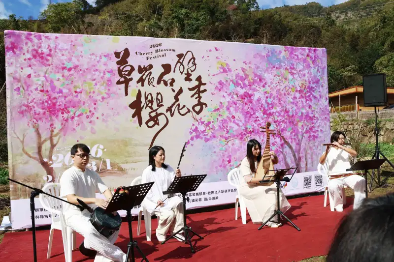 櫻花季宣傳活動結合音樂表演,表演者在粉色主視覺舞台上演奏樂曲,展現草嶺石壁融合自然景觀與文化藝術的獨特魅力。(圖/雲林縣政府提供)