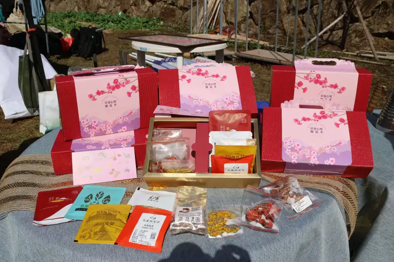 櫻花季期間同步展售多樣在地好物,包含農特產品與限定禮盒,讓遊客在賞櫻之餘,也能將草嶺石壁的自然美味帶回家。(圖/雲林縣政府提供)