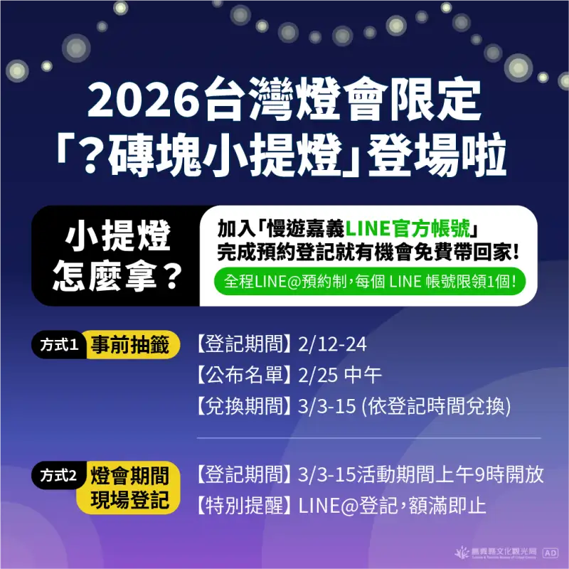 文化觀光局提醒,小提燈兌換時須出示本人手機中的LINE@兌換畫面進行核銷,截圖或拍照畫面無效,並須依預約時段準時到場,逾時將無法保留名額。建議民眾提早加入「慢遊嘉義LINE官方帳號」,提前完成預約規劃行程,把握參與2026台灣燈會及收藏限定「?磚塊小提燈」的機會!