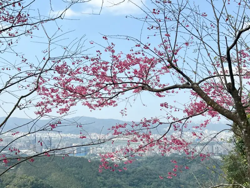 登高至中和烘爐地可俯瞰大臺北地區,山巒、櫻花與城市景觀交織的遼闊視野映入眼簾。(圖/新北市政府 提供)