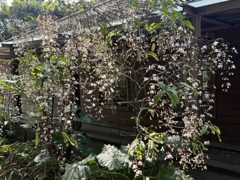 如果時間充足,也別錯過一旁充滿日式風格的綠化教室。教室外圍,垂枝茉莉潔白盛放,宮燈般的花朵輕輕搖曳,為空間灑落一抹清新明亮的春日氣息。仔細觀察,枝條上仍可見一串串白色花苞,在初春陽光下,靜靜等待綻放的時刻。再往前走,園區內的兩棵梅樹,白梅與粉梅也已陸續進入花期。白梅枝頭綴滿花朵,如雪花般點點盛開,為園區鋪陳出一片純白無暇的景致;粉嫩梅花間,蜜蜂忙碌穿梭採蜜,為園區增添春日生機。新的一年,就讓植物的美療癒您的身心。