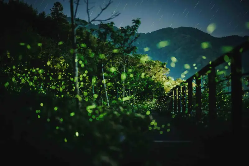 四月,瑞里的山林展現靜謐之美。清新的環境成為螢火蟲的理想棲息地,成群螢火蟲在林間飛舞,像星光點綴夜空,與周圍景致交織成童話般的夜景。