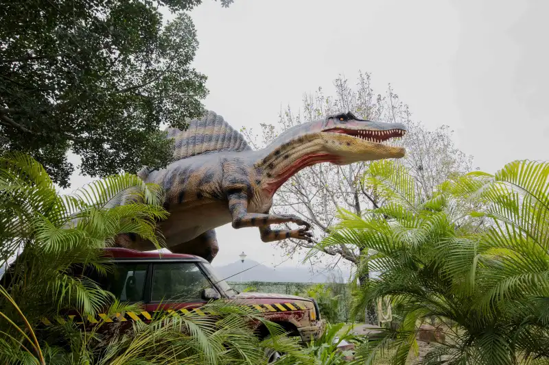 關渡碼頭「恐龍大復活關渡探險樂園」震撼登場,1:1擬真動態暴龍近距離現身,逼真聲光效果彷彿走入侏羅紀世界。(圖/台北市政府提供)