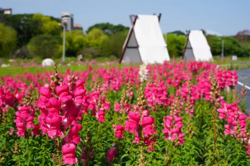 台北市政府水利處表示,今年花海以金黃色與粉色金魚草為主角,栽植數量約5萬株,盛開時隨風搖曳,宛如層層花浪翻湧,景致壯麗迷人。現場另栽種約6萬株紫藍色鼠尾草,以及維多利亞鼠尾草、薰衣草與墨西哥鼠尾草共計8萬株,花色交織、層次豐富,馥郁花香瀰漫其間,營造出彷彿置身南法鄉間的浪漫氛圍。