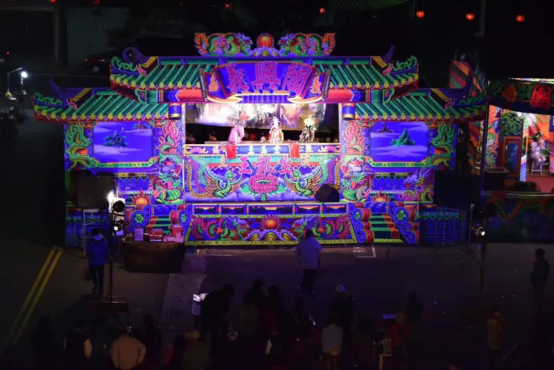 北門王爺藝饗節邀請義興閣掌中劇團演出搖滾布袋戲,華麗戲台與精彩演出吸引遊客參與,帶動地方文化觀光。(圖/雲管處提供)