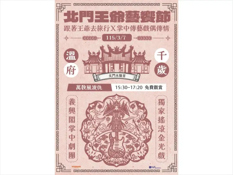 交通部觀光署雲嘉南濱海國家風景區管理處推動「北門王爺藝饗節」,結合藝文展演與觀光優惠,吸引民眾走訪北門體驗文化與旅遊魅力。配合3月7日布袋戲演出活動,雲管處推出打卡送折價券與集章抽黃金等活動,促進地方觀光發展。