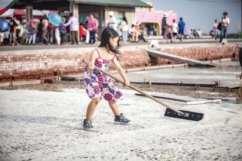 小朋友手持鹽耙體驗曬鹽樂趣,在井仔腳瓦盤鹽田感受百年鹽田文化傳承。(圖/雲嘉南管理處提供)