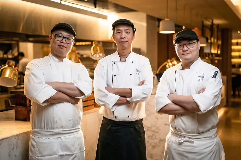 香港三大星級酒店廚藝團隊受邀來台獻藝,左起「香港東涌福朋喜來登酒店」主廚李嘉誠、「香港萬麗海景酒店」主廚李志明、及「香港天際萬豪酒店」主廚楊浩賢。( 圖/ 大溪笠復威斯汀提供)