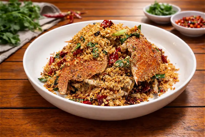 大排檔經典菜色避風塘炒蟹,以火熱鑊氣快炒鮮蟹並佐以金黃蒜酥,展現港廚精準的火候功力。 (圖/ 大溪笠復威斯汀提供)