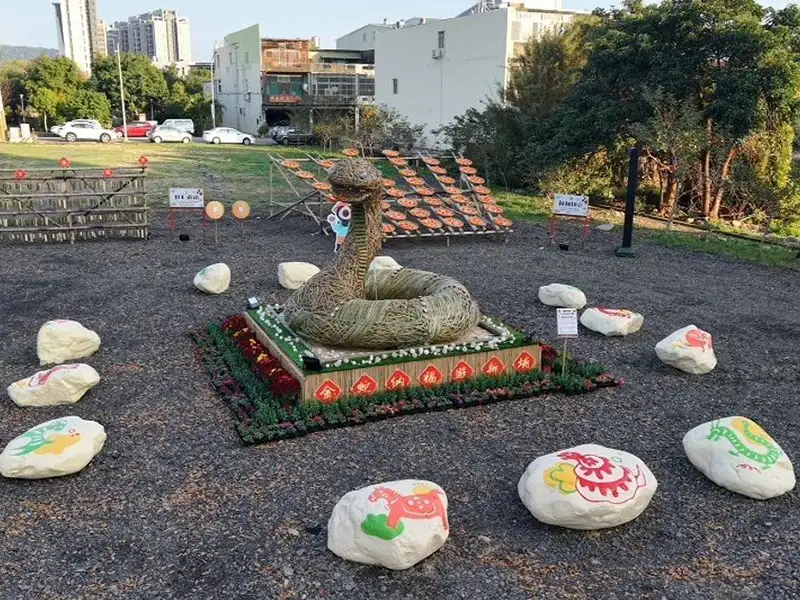 燈會特地邀請地景藝術家陳依慧操刀,以「永續竹藝、蛇耀未來」為概念,運用新埔在地竹材創作一系列燈藝作品,結合傳統竹編工藝與當代美學,呈現獨具特色的客家藝術風貌,燈會主裝置藝術「爺蛇」於新埔鎮市場預定地展出,以流暢的蛇形姿態象徵生命延續,所有竹材皆來自當地竹林,遵循永續林業原則,以低碳、環保方式進行採伐與創作。現場還設有「柿柿如意」、「步步高升」及「竹新祈福」等裝置藝術,營造濃厚年節氛圍,並提供民眾寫下心願、打卡留念,展期至4月7日。