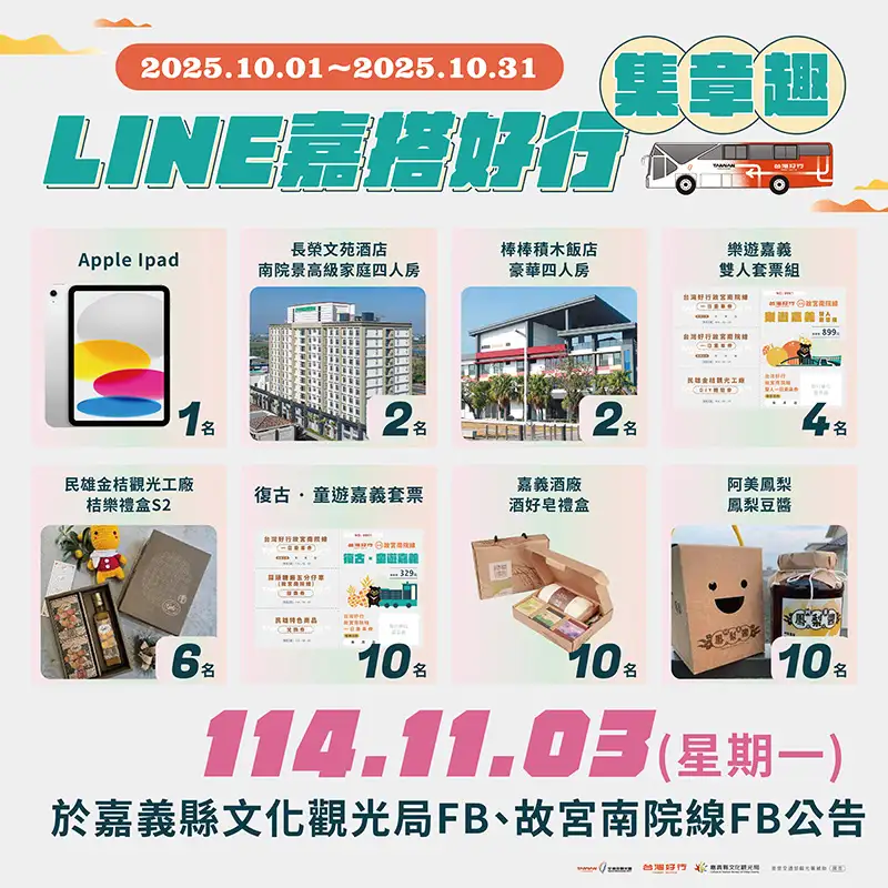 10月1日至10月31日「LINE 嘉搭好行x集章趣」活動期間,遊客只要在「台灣好行:故宮南院線」沿線指定的20個景點集章,即可參加抽獎,有機會獲得iPad、住宿券、套票以及多款嘉義特色伴手禮等豐富獎品。
