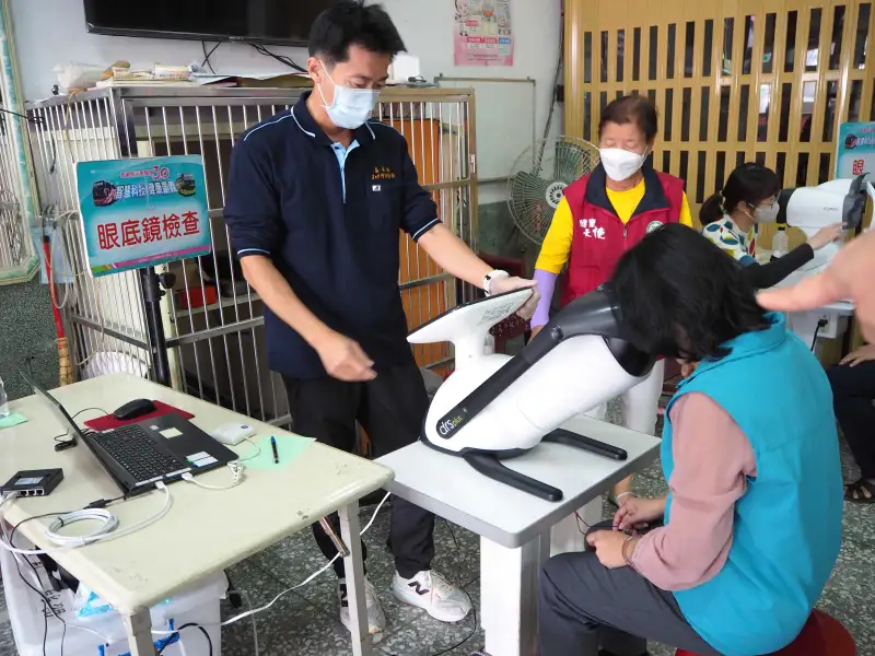 醫護人員協助民眾進行AI眼底攝影,偵測糖尿病視網膜病變與黃斑部病變,守護偏鄉視力健康。(圖/嘉義縣衛生局 提供)