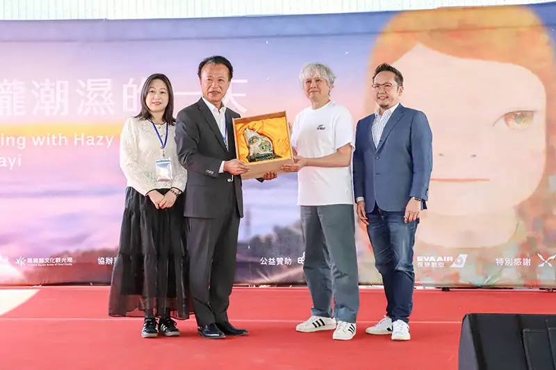 「跟著朦朧潮濕的一天回嘉」在具有歷史風貌的新港文化館25號倉庫展出,將「朦朧潮濕的一天」女孩形象結合阿里山太平雲梯的黃昏雲海,呈現嘉義獨特的自然景致。
