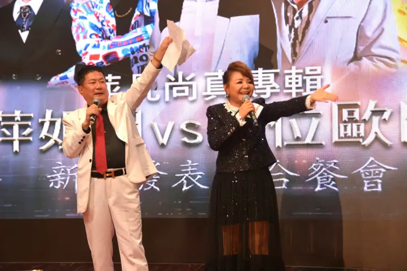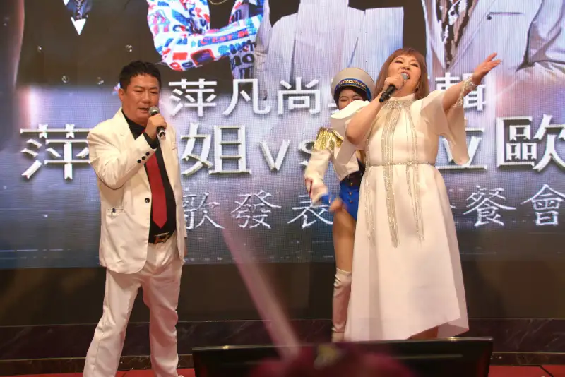 ▲金曲台語歌后方怡萍(右)新專輯中有收錄與富立衛星電視台董事長安忠(左)對唱的茫酥酥單曲。(記者鄭一銘攝)