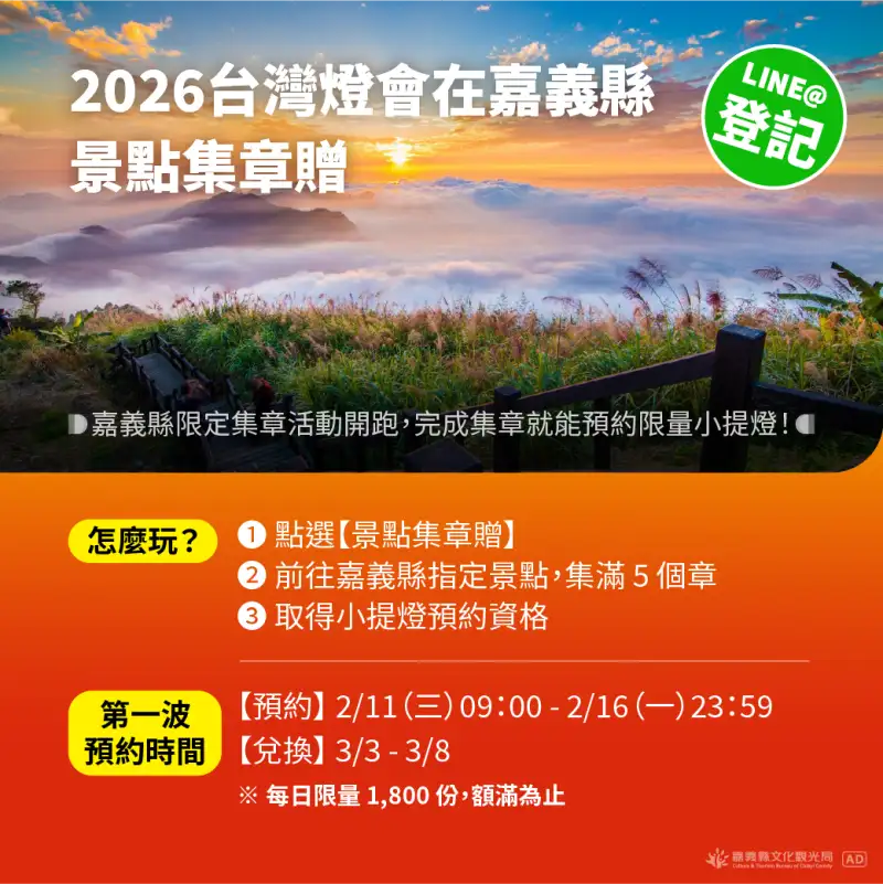 第一波小提燈預約將於2月11日(三)上午9時至2月16日(一)晚間23時59分開放,提供3月3日至3月8日期間的兌換時段,每日限量1,800份,額滿為止。文化觀光局提醒,只有完成集章的遊客才能進行預約,建議提前規劃旅遊行程,把握機會登記。所有集章、預約及兌換流程皆須透過「慢遊嘉義官方LINE」完成,並依預約時段到場領取,逾時將不保留名額。