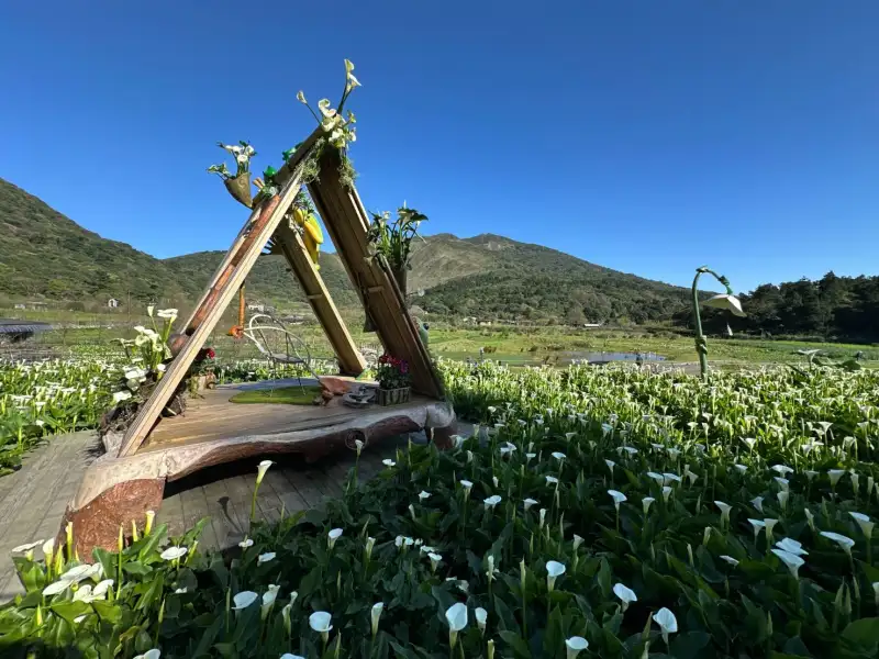 陽明山竹子湖大片海芋花海盛開,花田結合景觀裝置與山景,形成春季最具代表性的賞花景觀,吸引遊客前來拍照打卡。(圖/臺北市政府產業發展局)