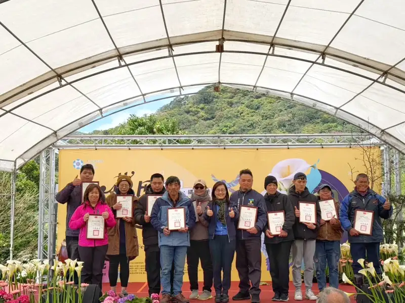 竹子湖海芋季開幕典禮中表揚在地農園與花藝設計展得獎農友,鼓勵農友結合創意花藝與農業體驗,打造竹子湖特色花田景觀。(圖/臺北市政府產業發展局)
