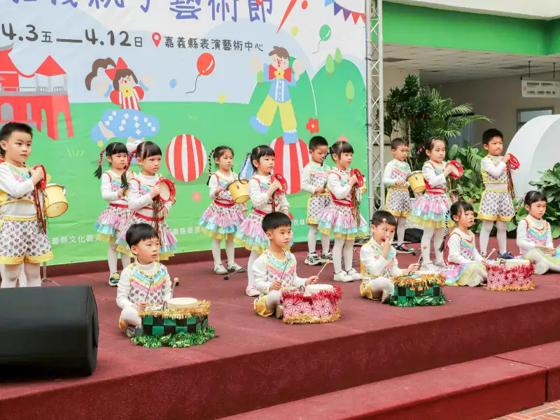 學童於記者會現場帶來活潑擊樂演出,展現藝術教育成果與親子互動活力。(圖/嘉義縣政府提供)
