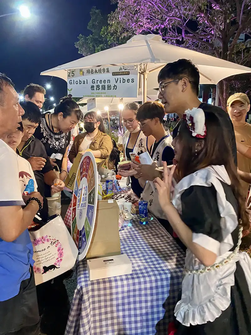 本次綠色永續市集,設計了以聯合國「永續發展目標(SDGs)」為主題的互動轉盤,邀請民眾轉出SDGs 17項目標之一,並分享生活中實踐永續的具體案例。現場民眾反應熱烈,透過趣味互動加深了對永續議題的理解,也激發從日常生活中實踐環保與社會責任的行動。特別的是,來自聖文森、貝里斯、泰國、越南、馬來西亞與印尼的外籍學生也一同參與活動,展現崑山科大校園的國際多元特色,他們以熱情活力與民眾交流永續觀念,為市集增添國際色彩。