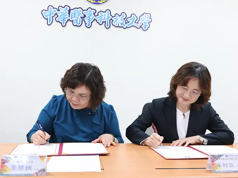 簽約結盟儀式下午2時在中華醫大舉行,由中華醫大校長李碧娥和育英醫專代理校長卓怡孜代表雙方簽署,中華醫大醫事學院院長楊堉麟、護理學院院長謝政蓉、民生學院院長姜泰安等3院院長偕同相關系科主任,育英醫專秘書室主任王健任、護理科主任陳孟勤、老人健康服務事業管理科主任林盈諄、化妝品應用與管理科主任朱立雯等,一起出席見證雙方啟動跨校合作契機。