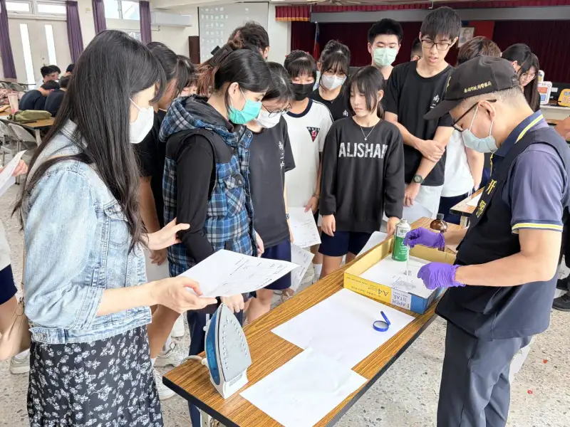 其中最受學生關注的為「指紋採樣與比對」體驗。刑事鑑識人員現場示範採樣流程,包括使用印泥、指紋卡及工具進行壓模取樣,並講解指紋因具有獨特性,是刑事偵查的重要證據。學生透過放大鏡觀察不同指紋類型,如「弓形紋」、「迴紋」、「斗紋」等,並操作指紋比對軟體進行模擬分析,實際感受科學辦案的嚴謹與精確。