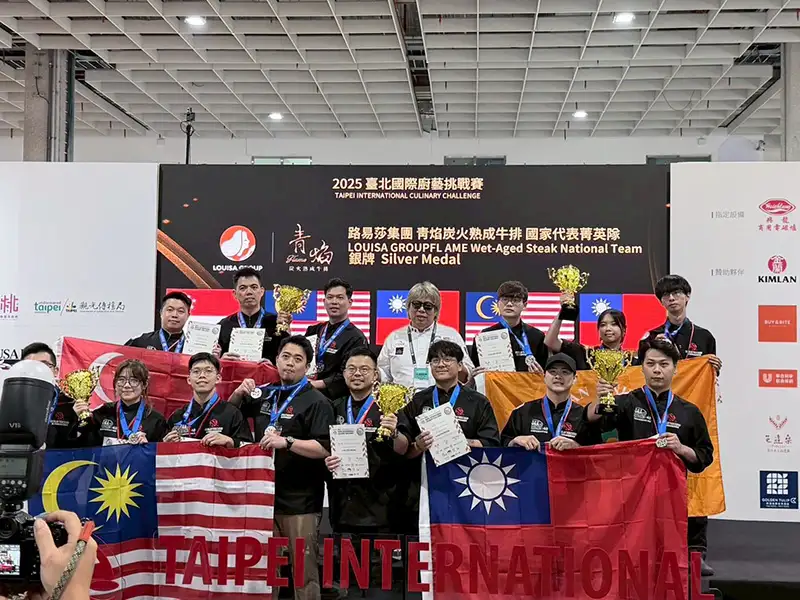 其中二年級許博智、三年級許之睿及四年級周佳怡三位同學組隊參與本賽事中的「國家代表菁英隊」項目,以「台灣之旅」為套餐主題獲得銀牌,呈現跨地域、跨文化的料理詮釋,套餐從前菜、主菜到甜點皆以台灣地景與飲食文化為軸線,串聯一趟從南而北的美食旅程,理念清晰,意象鮮明,深受評審肯定。