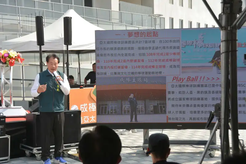 黃偉哲在致詞時感性表示,亞太國際棒球訓練中心是台南近年來最重要的建設之一,建設經費約33.65億元,園區占地約30.27公頃,從少棒、青少棒場地的啟用,到今天成棒主球場的開賽,象徵著台南棒球產業鏈的最後一塊拼圖正式到位。