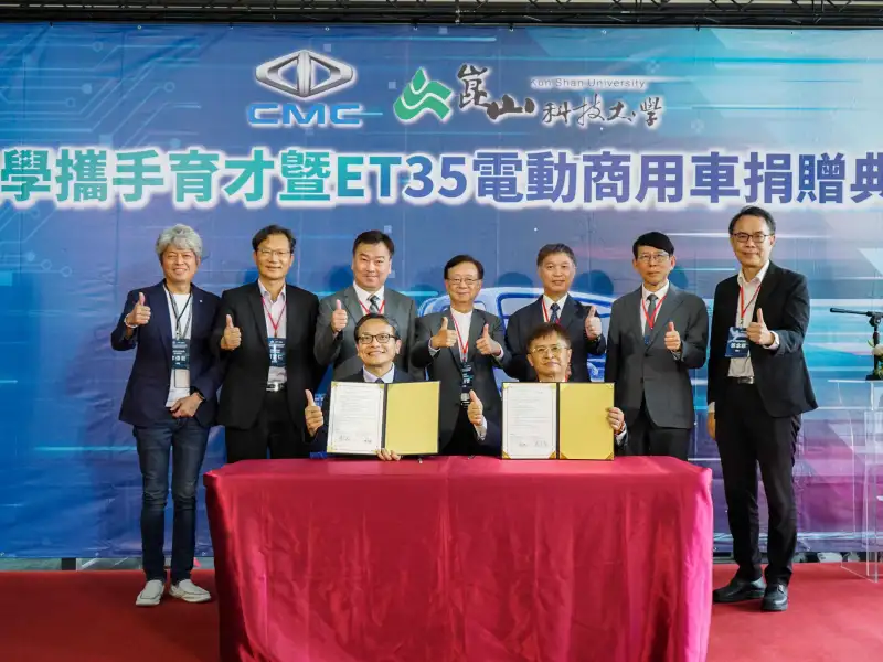 崑山科大獲中華汽車捐贈ET35電動商用車並簽署MOU,推動電動載具研發與綠能人才培育。(圖/崑山科技大學提供)